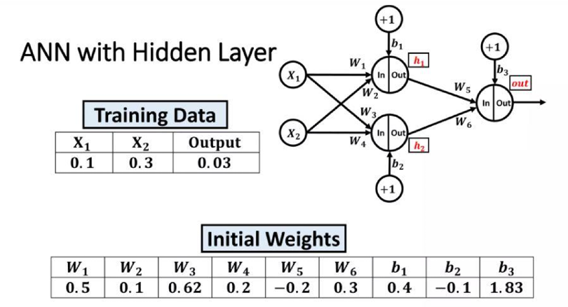 \large \frac{\partial E}{\partial W_1} = -(y - out)(out)(1 - out)(W_5)(h_1)(1 - h_1)(X_1)$$$$\large \frac{\partial E}{\partial W_2} = -(y - out)(out)(1 - out)(W_5)(h_1)(1 - h_1)(X_2)$$$$\large \frac{\partial E}{\partial W_3} = -(y - out)(out)(1 - out)(W_6)(h_2)(1 - h_2)(X_1)$$$$\large \frac{\partial E}{\partial W_4} = -(y - out)(out)(1 - out)(W_6)(h_2)(1 - h_2)(X_2)