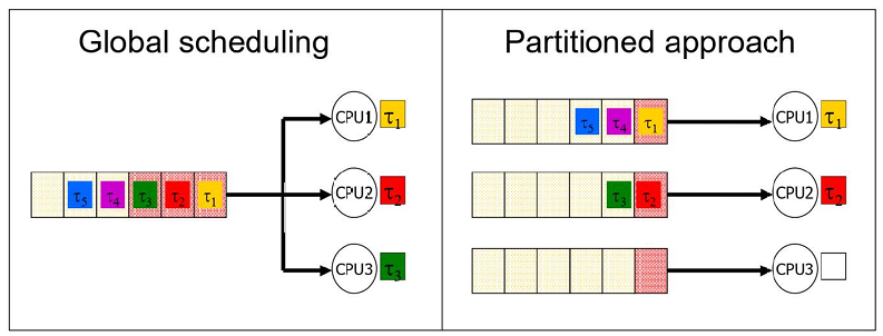 | Partitioned Scheduling | Core isolation. No migration overhead. Simplified queue management. | NP-hard task allocation problem. |