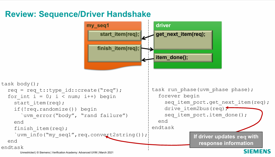 - The driver initiates communication by pulling transactions from the sequencer via the